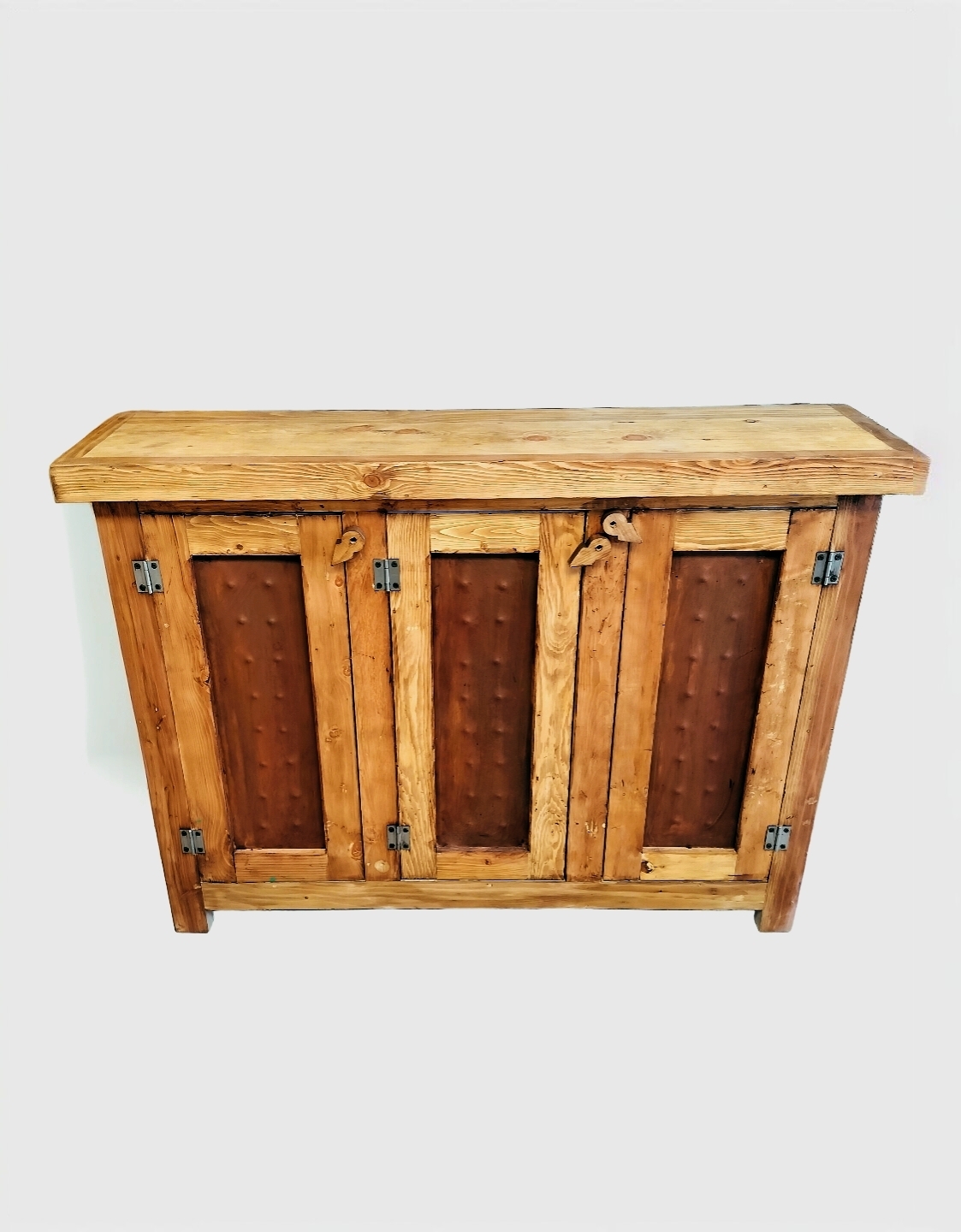 This handcrafted piece features three metal sheet door panels, each carefully framed in solid wood and finished in a rich all-natural brown tone, sealed with a premium wax paste finish for subtle sheen and lasting protection. Measuring 48 inches long, 12 inches deep, and 36 inches high, the Santa Fe sideboard offers the perfect balance of compact versatility and bold farmhouse style.